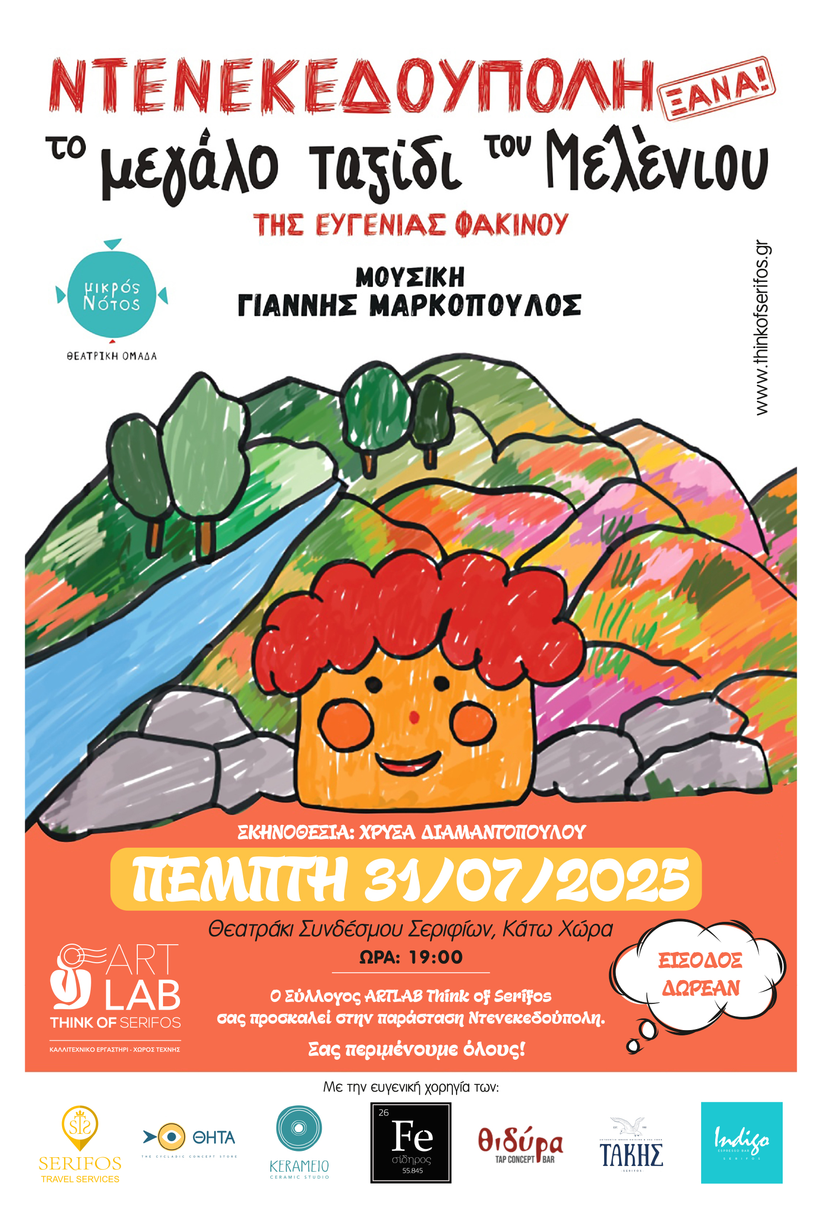 Η Ντενεκεδούπολη πάει στη Σέριφο! Το ART LAB σε συνεργασία με τη Θεατρική ομάδα “Μικρός Νότος” σας προσκαλεί στο Θεατράκι της Κάτω Χώρας την Πέμπτη 31 Ιουλίου στις 7μμ. να ταξιδέψουμε μαζί με τον Μελένιο.